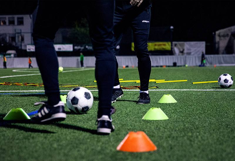 mit einer maximalen Gruppengröße von vier Spielern, um elementare Grundlagen in Technik und Taktik, mit und ohne Gegnerdruck, offensiv wie defensiv im direkten Vergleich, mit sofortigen Korrekturen und hoher Wiederholungszahl, zu gewährleisten. Schulung der Kernkompetenz im Fußball 1-1, 2-2 defensiv und offensiv.